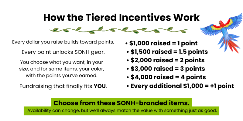 These bonus items are just the beginning. Fundraisers will also have the opportunity to earn additional SONH-branded gear through our new tiered incentives.