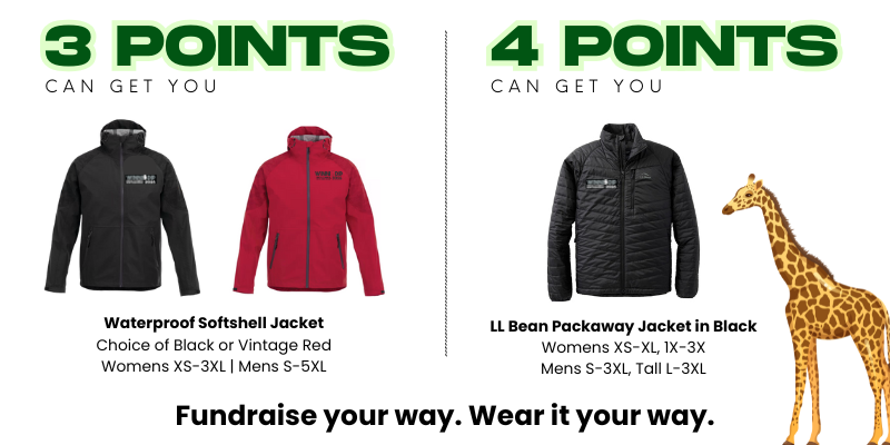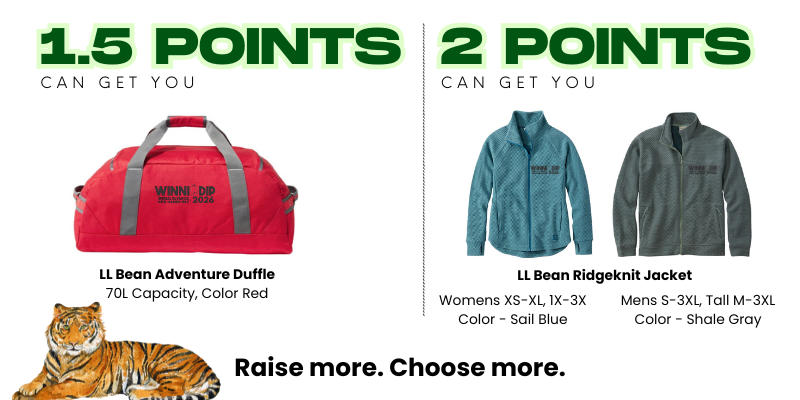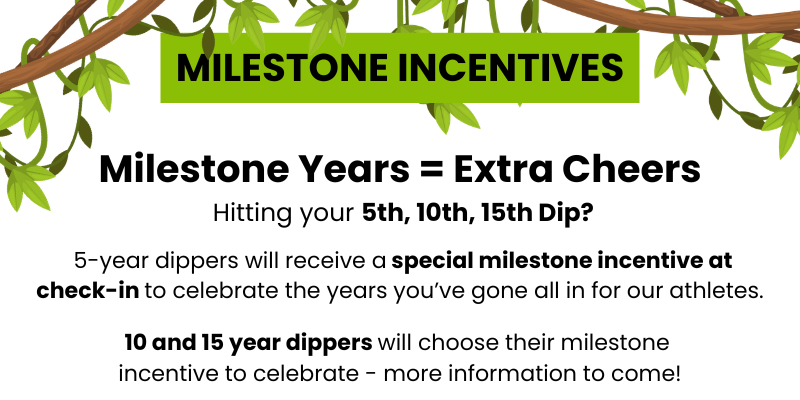 Each Dipper who meets the fundraising minimum ($400) will receive one Dip clothing item of their choice (see choices below). We’ll have a limited number of incentives available at check-in—first come, first served. If we owe you an item after the event, don’t worry! We’ll mail it to you within 6–8 weeks.